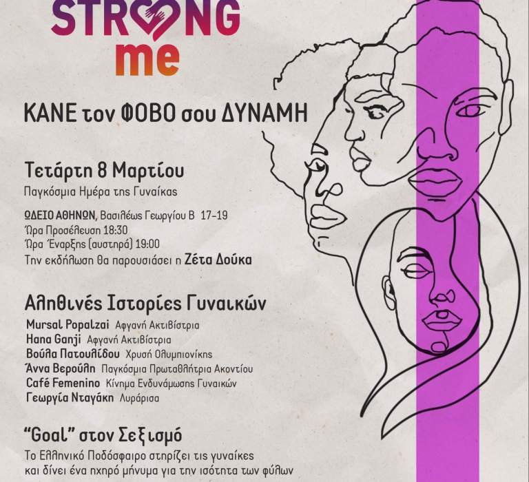 To Strong Me, το κίνημα που γεννήθηκε πριν λίγο καιρό και δίνει φωνή στις γυναίκες πολεμώντας τον σεξισμό και τα έμφυλα στερεότυπα, διοργανώνει στις 8 του Μάρτη, Παγκόσμια Ημέρα της Γυναίκας, μια μεγάλη γιορτή. Μια γιορτή που στέλνει ηχηρό μήνυμα κατά της έμφυλης βίας. Μια γιορτή με τη συμμετοχή γυναικών που σήμερα πρωταγωνιστούν στη ζωή και στους αγώνες.