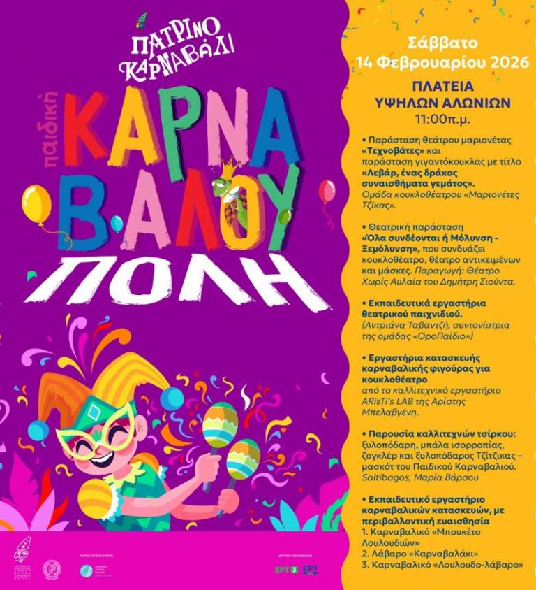 Το καρναβαλικό θερμόμετρο για τους μικρούς θα ανέβει με ένα χορταστικό πρόγραμμα ποικίλων δράσεων που έχει ετοιμάσει η ΚΕΔΗΠ-Καρναβάλι Πάτρας, δίνοντας εορταστικό, αποκριάτικο τόνο στην πλατεία της Πάτρας που θα μεταμορφωθεί σε παραμυθένιο παιδόκοσμο.