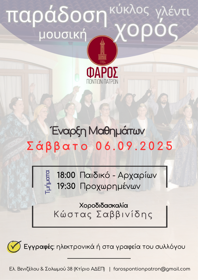 Το ραντεβού του με τους φίλους της ποντιακής παράδοσης ανακοινώνει ο Φάρος Ποντίων Πατρών για την πολιτιστική περίοδο 2025-2026.