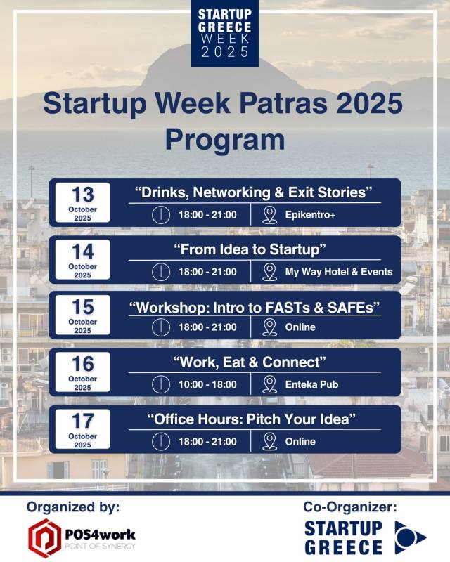 Το Startup Week Patras 2025 επιστρέφει με πέντε δράσεις που φέρνουν κοντά την κοινότητα της καινοτομίας.