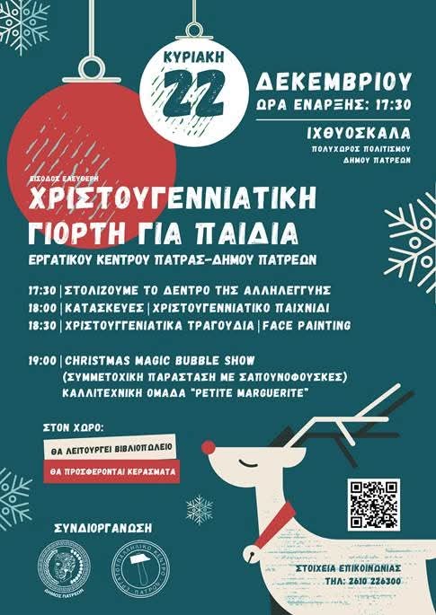 Ο Πολυχώρος Πολιτισμού (πρώην Ιχθυόσκαλα) στις 5.30 το απόγευμα την Κυριακή 22 Δεκεμβρίου θα γεμίσει από παιδικά χαμόγελα. Η εκδήλωση πραγματοποιείται σε συνεργασία με το Εργατικό Κέντρο της Πάτρας. Τα παιδιά θα δημιουργήσουν τις δικές του εορταστικές κατασκευές, θα παίξουν χριστουγεννιάτικα παιχνίδια, θα τραγουδήσουν Χριστουγεννιάτικα τραγούδια και θα παρακολουθήσουν την Παράσταση BUBBLE SHOW από τους LA PETITE MARQUERITE.