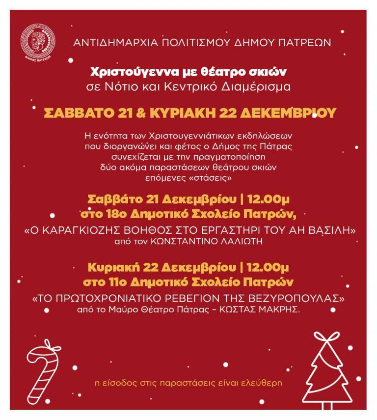 Παραστάσεις θεάτρου Σκιών, παραστάσεις δρόμου στο κέντρο της Πάτρας και μία ακόμα Χριστουγεννιάτικη εκδήλωση για τα παιδιά σε συνεργασία με το Εργατικό Κέντρο Πάτρας, συνθέτουν το παζλ των εκδηλώσεων που διοργανώνει ο δήμος για τον εορτασμό των Χριστουγέννων του 2024.