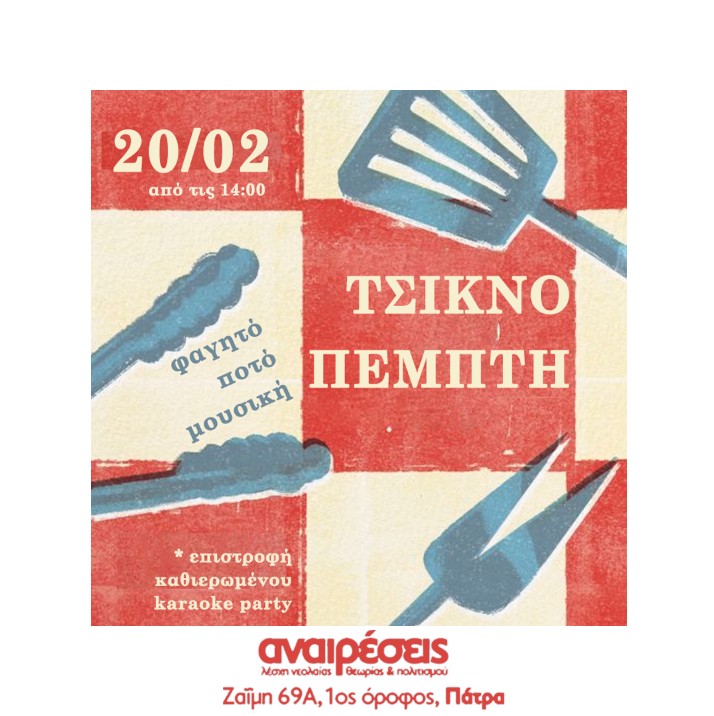 Σας περιμένουμε και την φετινή Τσικνοπέμπτη 20/02 στη λέσχη Αναιρέσεις Πάτρας, από τις 14:00, για ολοήμερο συλλογικό φαγοπότι και γλέντι με άφθονες μπύρες, ποτά, σουβλάκια και φυσικά το καθιερωμένο karaoke!