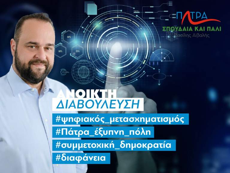 Με τις θέσεις για τον «Ψηφιακό Μετασχηματισμό» συνεχίζεται από σήμερα, 4 Αυγούστου, η δημόσια διαβούλευση της παράταξης «Πάτρα, Σπουδαία και Πάλι» με επικεφαλής τον υποψήφιο δήμαρχο Πατρέων Βασίλη Αϊβαλή.