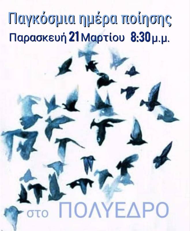 Το Πολύεδρο γιορτάζει την Παγκόσμια ημέρα ποίησης, με καλεσμένους ποιητές, εικαστικούς, μουσικούς, πανεπιστημιακούς και φίλους της ποίησης την Παρασκευή 21 Μαρτίου, στις 8.30 το βράδυ. Είναι μια βραδιά αφιερωμένη στην ποίηση και οι καλεσμένοι διαβάζουν δικά τους ποιήματα ή αγαπημένα ποιήματα άλλων δημιουργών. Ο κιθαρίστας Δημήτρης Μακρής θα συνοδεύσει μελωδικά τις αναγνώσεις. Οι συμμετέχοντες θα έχουν την ευκαιρία να απολαύσουν την μουσικότητα των στίχων, να νιώσουν την δύναμη των λέξεων και να συνομιλήσουν με την γλώσσα της ποίησης.