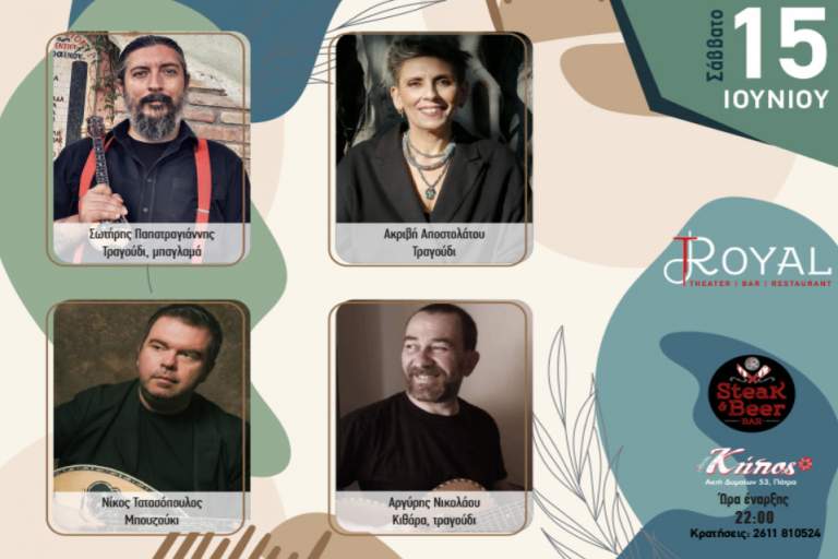 Το Σάββατο 15 Ιουνίου στις 10 το βράδυ διοργανώνεται η πρώτη ρεμπέτικη βραδιά στον κήπο του Royal, για το φετινό καλοκαίρι! Ο Σωτήρης Παπατραγιάννης ξανά μαζί με τους φίλους του, για ένα μοναδικό Σαββατόβραδο. Στο μπουζούκι ο σπουδαίος δεξιοτέχνης Νίκος Τατασόπουλος! Μαζί τους οι εξαιρετικοί Πατρινοί μουσικοί, Ακριβή Αποστολάτου στο τραγούδι και Αργύρης Νικολάου στην κιθάρα