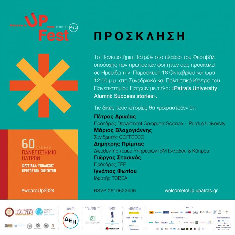 To «Welcome to UP 2024», το μεγάλο Φεστιβάλ Υποδοχής Πρωτοετών Φοιτητών Πανεπιστημίου Πατρών, συναντά επιτυχημένους αποφοίτους του Ιδρύματος και μεταδίδει τη γνώση και την εμπειρία τους στους φοιτητές που μόλις ξεκινούν το ταξίδι της ανώτατης εκπαίδευσης, δίνοντάς τους κατευθύνσεις «πλοήγησης» με βάση τις σύγχρονες ανάγκες της επιστήμης και της αγοράς.