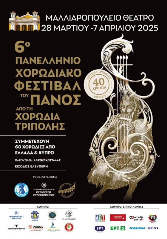 Το τριήμερο 5 -7 Απριλίου 2025 ολοκληρώθηκε με πολύ μεγάλη επιτυχία το 6ο Πανελλήνιο Χορωδιακό Φεστιβάλ του Πανός, στην Τρίπολη. 60 χορωδίες από Ελλάδα και Κύπρο ανταποκρίθηκαν με χαρά στην πρόσκληση της Χορωδίας Τρίπολης, γεμίζοντας μελωδίες το Μαλλιαροπούλειο Δημοτικό Θέατρο για δύο εβδομάδες. Το Φεστιβάλ ήταν αφιερωμένο στον μεγάλο μας μουσικοσυνθέτη, Μίκη Θεοδωράκη. 100 χρόνια συμπληρώνονται από την γέννησή του και η πολιτιστική κληρονομιά που άφησε πίσω του θα αποτελεί πνευματική τροφή για τις επόμενες γενιές.